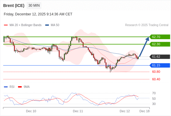 在 61.15 之上,看涨,目标价位为 62.30 ,然后为 62.70 。