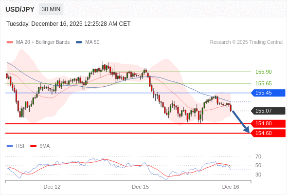 在 155.45 之下,看跌,目标价位为 154.80 ,然后为 154.60 。