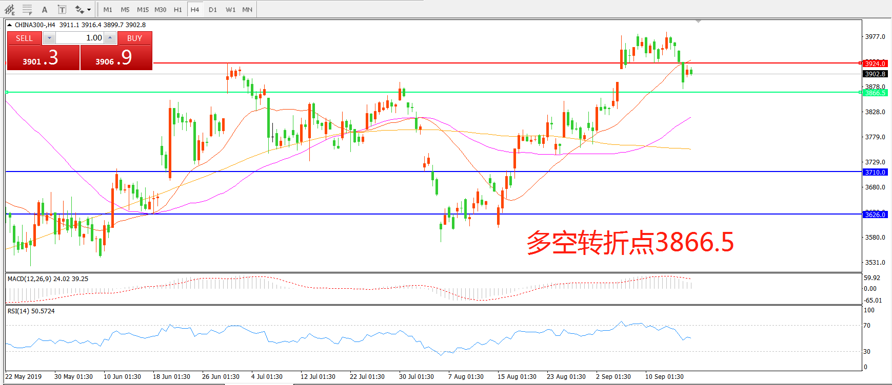 4小时图看,沪深300延续高位震荡,整体走势走弱,但均线系统依然呈多头排列,MACD红柱减少,RSI指标向下,日内依然有回落风险,但中期走势依然偏多。