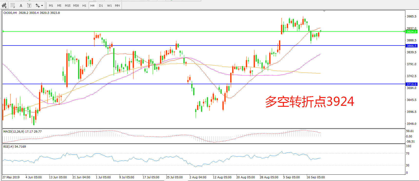 4小时图看,沪深300延续高位震荡,整体走势走弱,但均线系统依然呈多头排列,MACD红柱减少,RSI指标向下,日内依然有回落风险,但中期走势依然偏多。