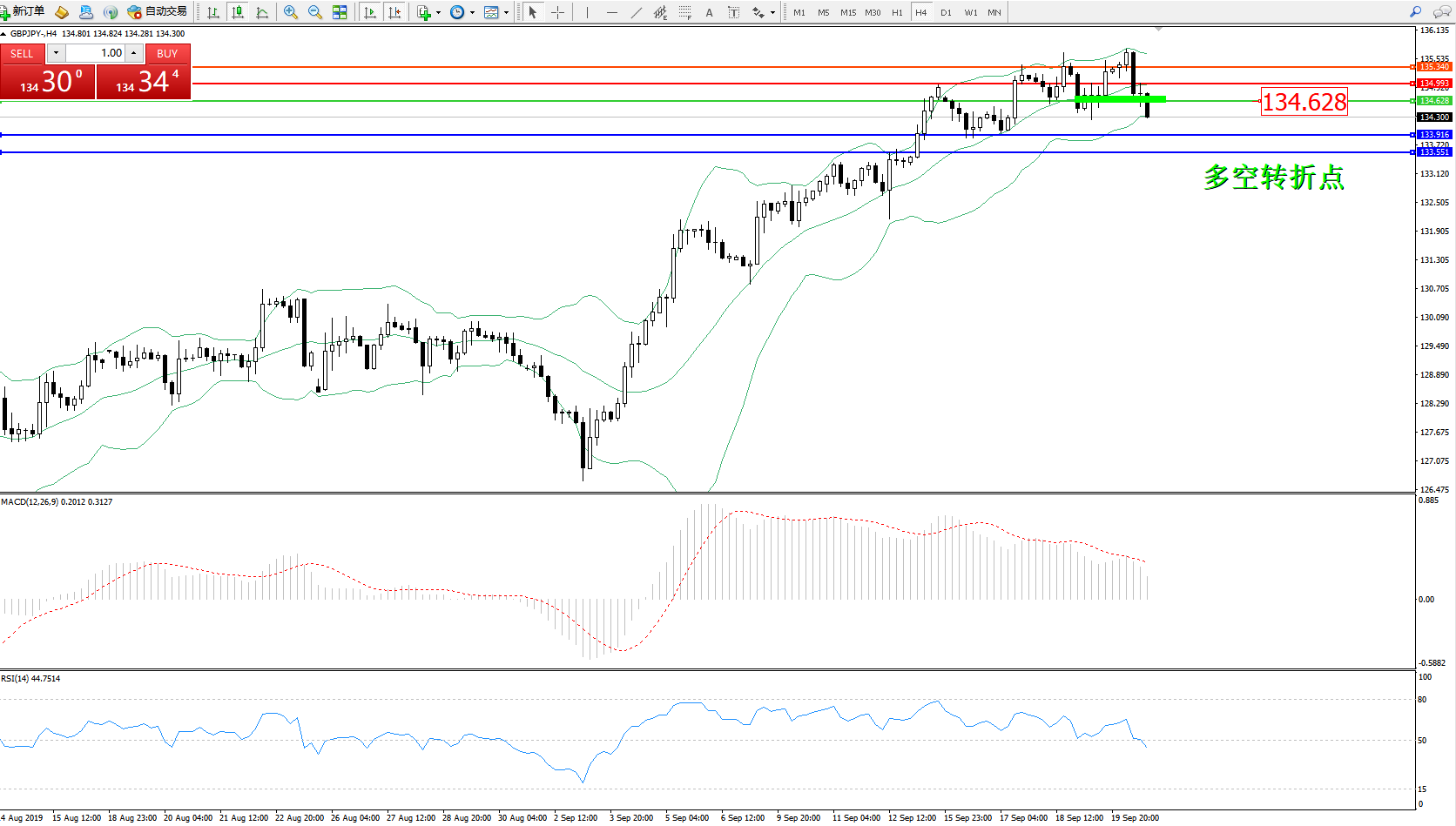 交易策略:134.628下方看跌,目标133.916、133.551