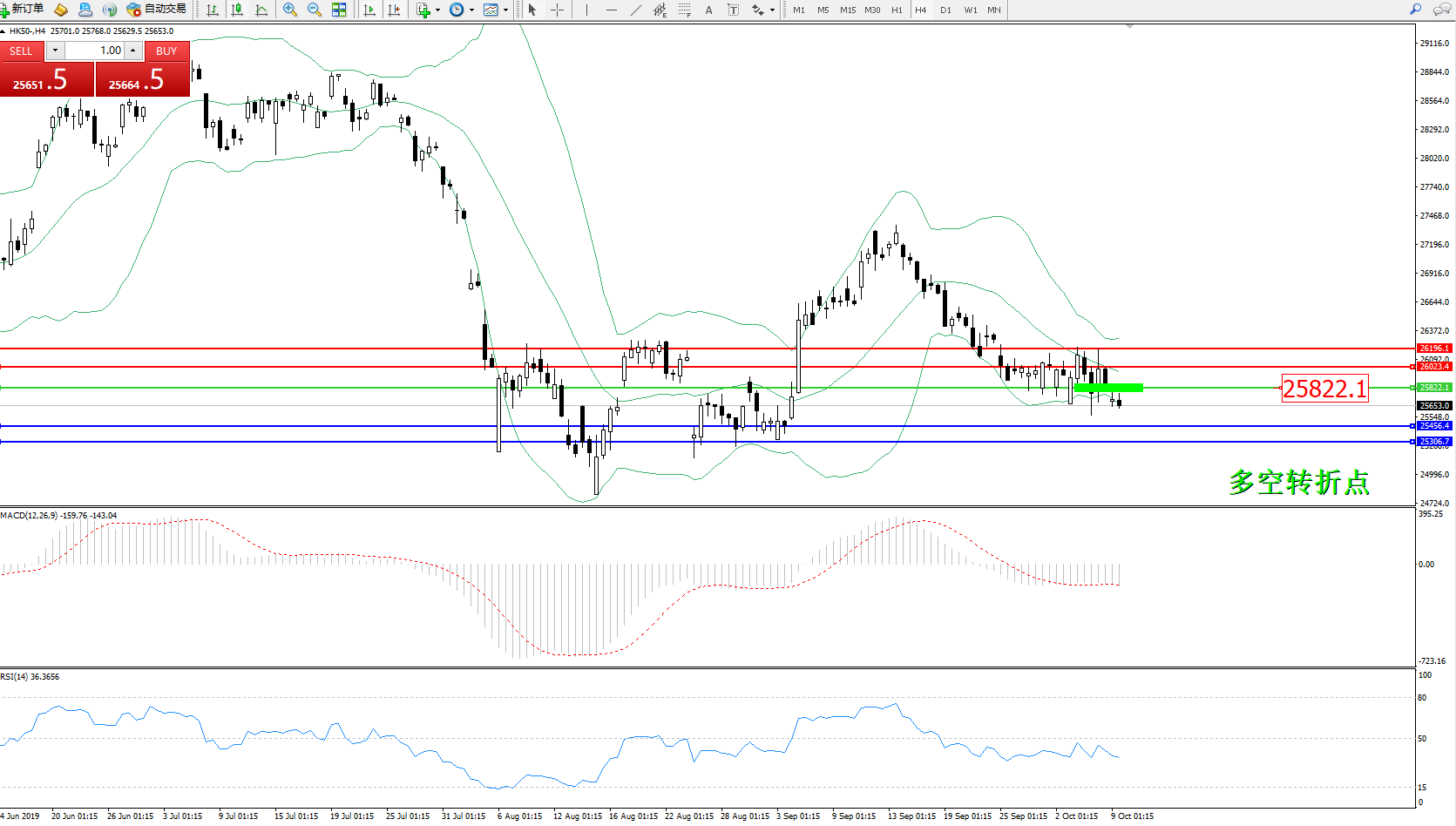 香港恒生指数10月9日(周三)收盘下跌210.59点,跌幅0.81%,报25682.81点;港股早上跟随外围低开后再下滑,恒指低见25682,最多跌211点。市场仍然聚焦贸易关系的结果,整体观望氛围较为浓厚。近期美国各项经济指标疲弱,鲍威尔的发言也令人失望。恒指近期走势反复,投资者同时还在关注国际贸易局势的进展与经济数据。