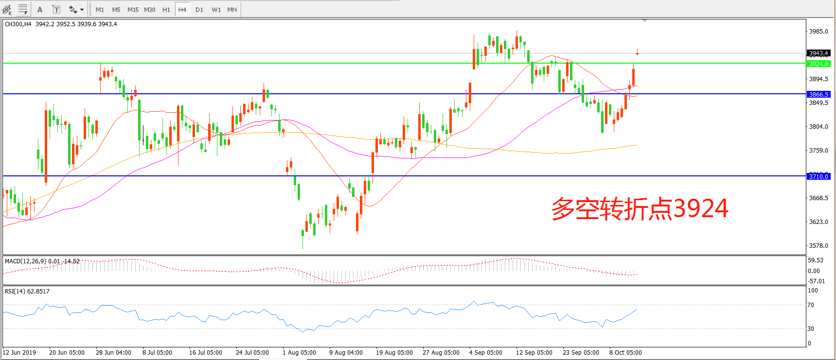 4小时图看,沪深300阳线连续拉升,整体走势偏强,今日跳空高开后,重点关注3924一线得失,如能站稳这一位置,沪深300有望新来新一波涨势,均线系统走平,RSI指标向上,日内延续上行概率较大。