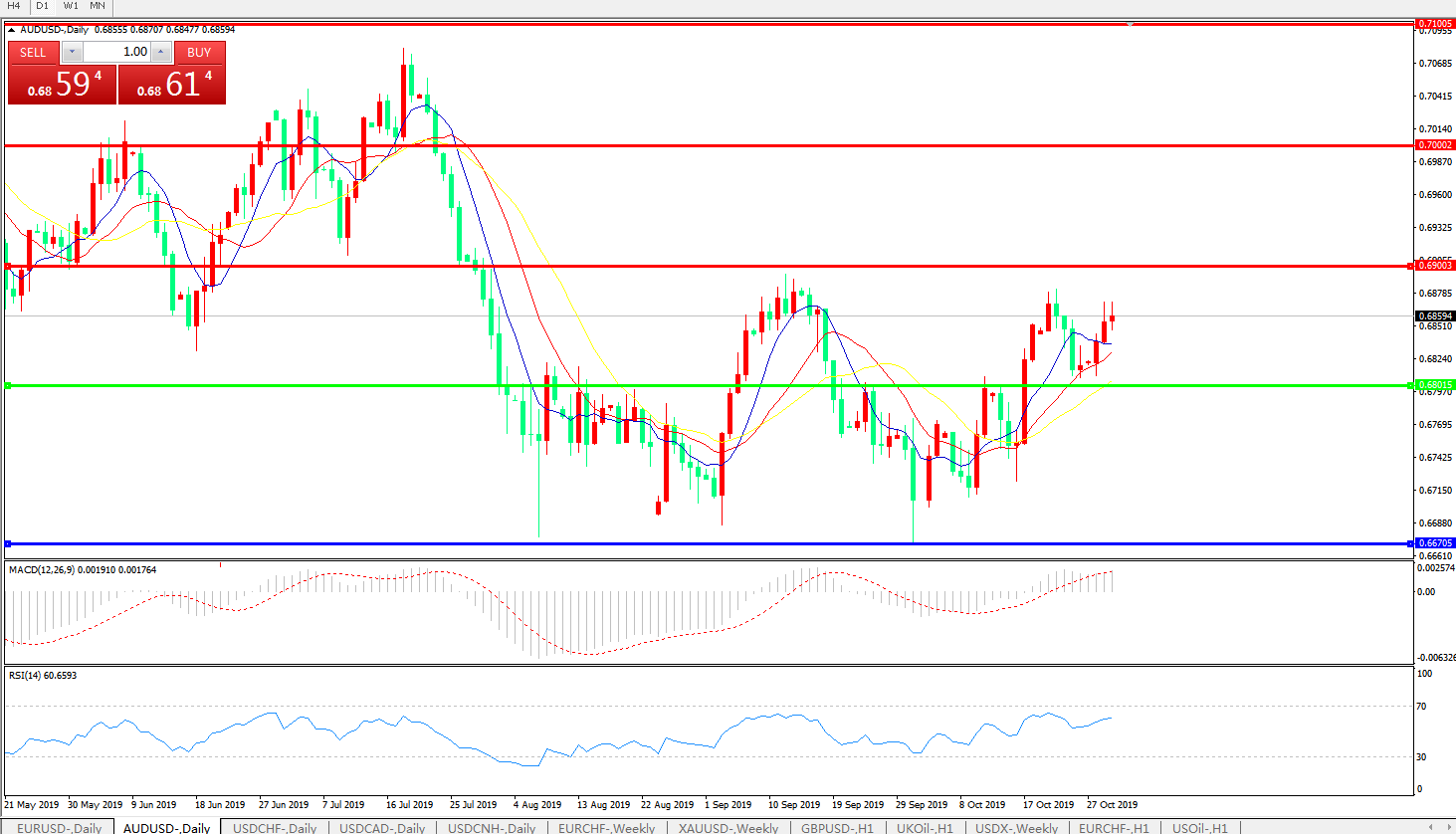 澳元兑美元在周二日内震荡走高,纽约时段开盘前触及上周二以来新高0.6861,主要是受到了全球贸易消息本周以来持续趋向乐观的带动,因为贸易对于澳洲这样的经济体而言尤为重要; 不过,澳元兑美元涨势仍然受到美元指数表现强劲的压制。一方面贸易向好同样提振了美元指数本身,另一方面,虽然美联储在周三再度降息已成定局,但是市场却提前开始押注其会在此后暂缓宽松脚步,这反而令美元得到提振。因此,澳元兑美元日内并未能一鼓作气强势单边上行;l 从趋势上来看,澳元兑美元也仍处于漫长的筑底过程中,上周高点0.6883和9月中旬的高点0.6895仍然是强势的趋势阻力,升破后站上0.69关口,方可确认上行趋势的延续。但这在本周三美联储决议直至下周二澳洲联储决议之前,难度仍然相当大。短期内,澳元兑美元仍将维持横盘波动走势。