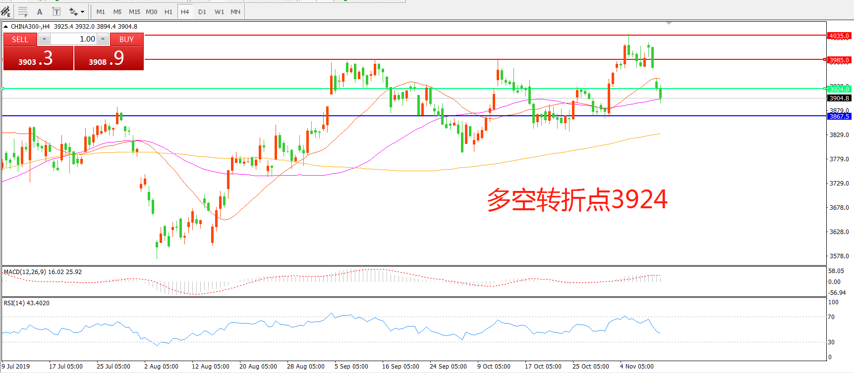 4小时图看,沪深300低开低走,整体走势偏弱,均线系统走平,MACD红柱减少,RSI指标向下,日内延续重点关注是否有缺口回补态势,短期震荡下行概率较大。