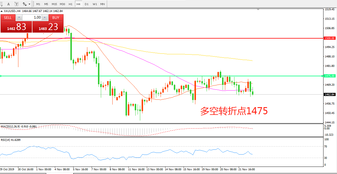 4小时图看,金价震荡下行,1475附近存在明显阻力,均线系统走平,MACD红柱减少,RSI指标走平,日内震荡下行概率较大。