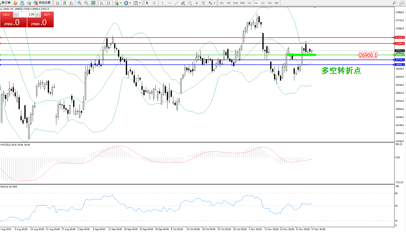 香港恒生指数11月27日(周三)收盘上涨40.08点,涨幅0.15%,报26954.00点;港股小幅高开29点后,再回落倒跌低见26866。随后再逐步造好而回升,最高见26974。26日中美国贸易代表同意就第一阶段协议磋商的剩余事项保持沟通。市场重点关注双方是否会在12月15日美国对中国商品征加新一轮关税日期前达成折中方案。国际贸易谈判进展的消息与鲍威尔对美国经济状况的积极评价提振了市场信心。