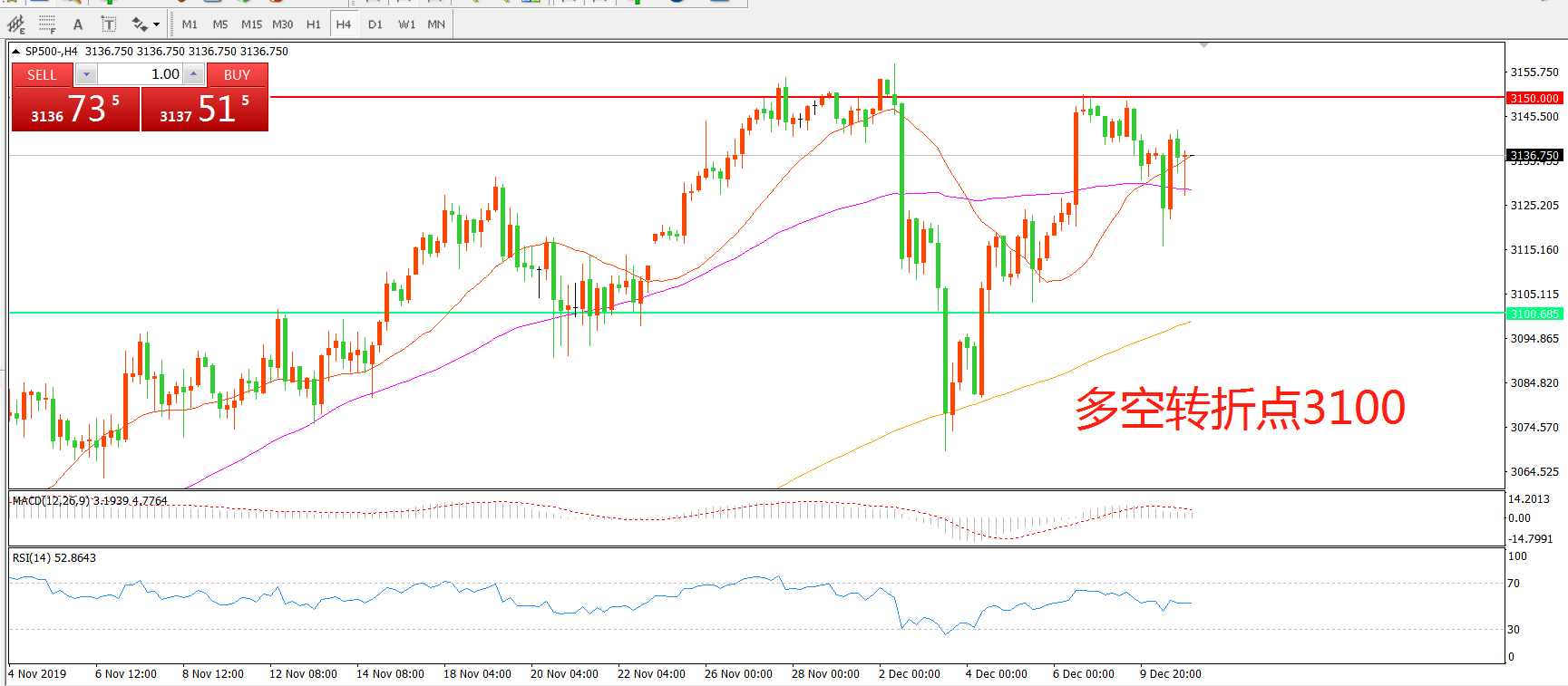 4小时图看,标普以触碰3150阻力后再次下行,显示上方阻力较强,整体走势偏向高位震荡,MACD绿柱缩短,红柱增加,RSI指标走平,日内震荡上行概率较大。
