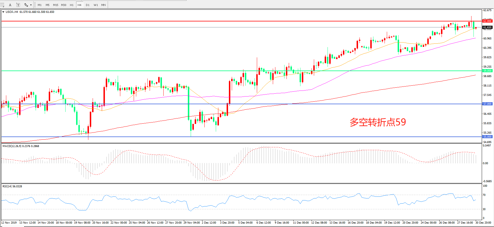 4小时图看,油价呈现高位震荡,再次冲击62美元阻力后校服回落,均线系统呈现多头排列,MACD红柱缩短,RSI指标走平,日内延续上行概率较大。