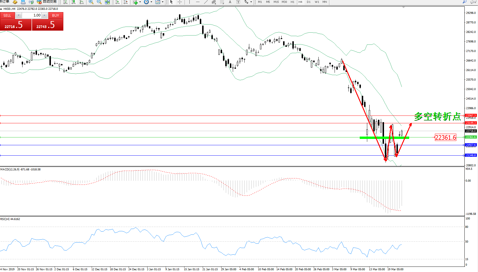 恒指HK50 ——4小时K线图显示: