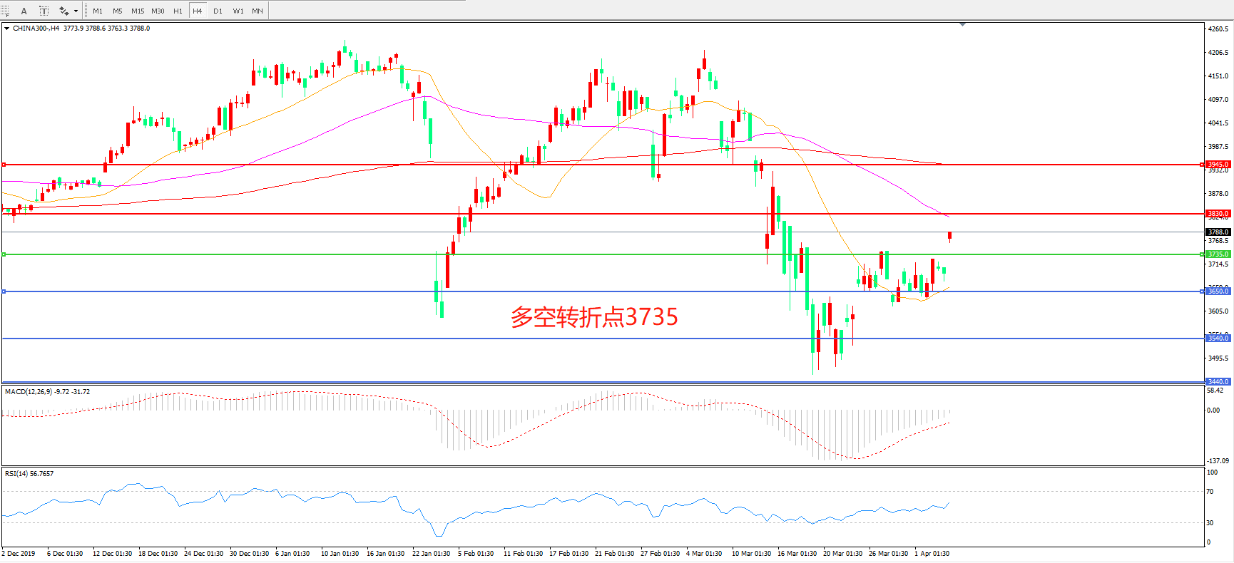 4小时图看,沪深跳空高开,整体表现偏强,短期拐头向上,MACD绿柱缩短,RSI指标向上,日内延续上行概率较大。