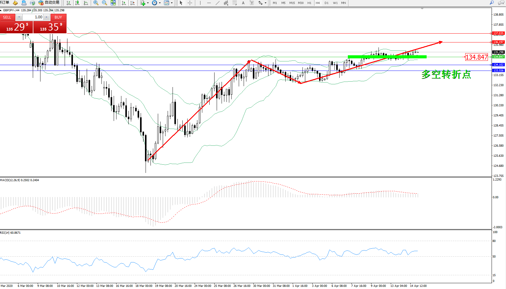 交易策略:134.847上方看涨,目标136.197、137.035