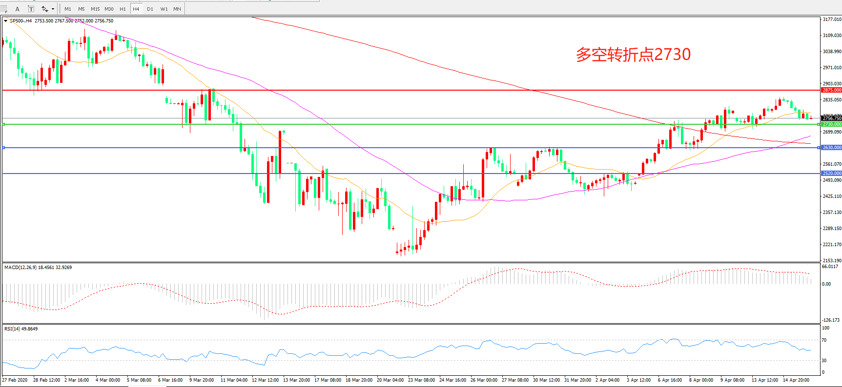 4小时图看,标普500回踩2730支撑,整体依然处于上行趋势内,MACD红柱缩短,RSI指标走平,日内震荡上行概率较大。