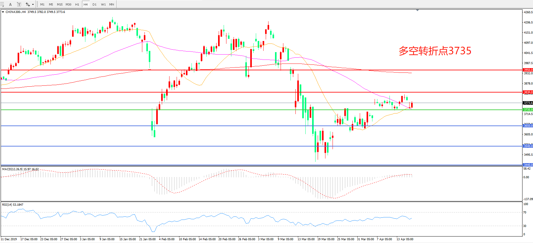 4小时图看,沪深300延续高位震荡,整体波幅不大,短期均线拐头向上,有形成金叉迹象,MACD红柱增加,RSI指标走平,日内延续上行概率较大。