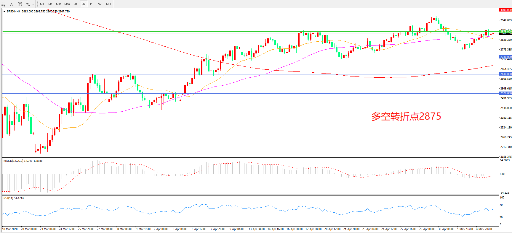 4小时图看,标普500延续震荡,整体波幅不大,2875成为上方阻力,2730成为下方支撑,均线系统走平, MACD红柱减少,绿柱增加,RSI指标走平,日内震荡下行概率较大。