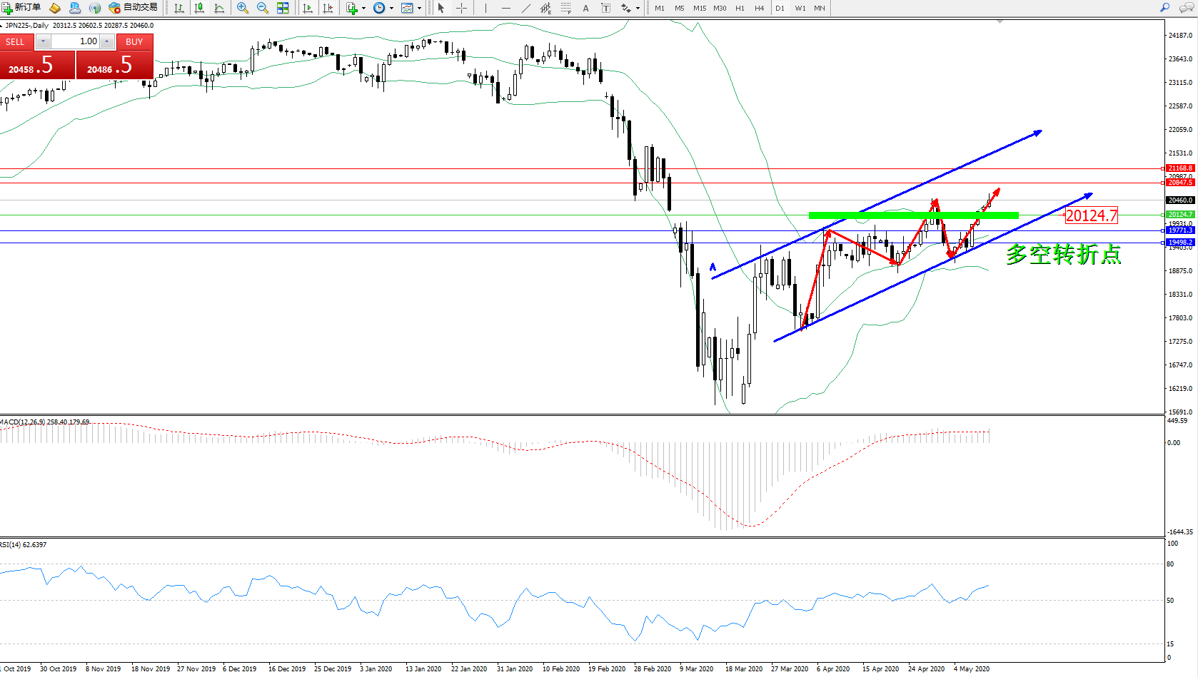 交易策略:20124上方看涨,目标20847、21168