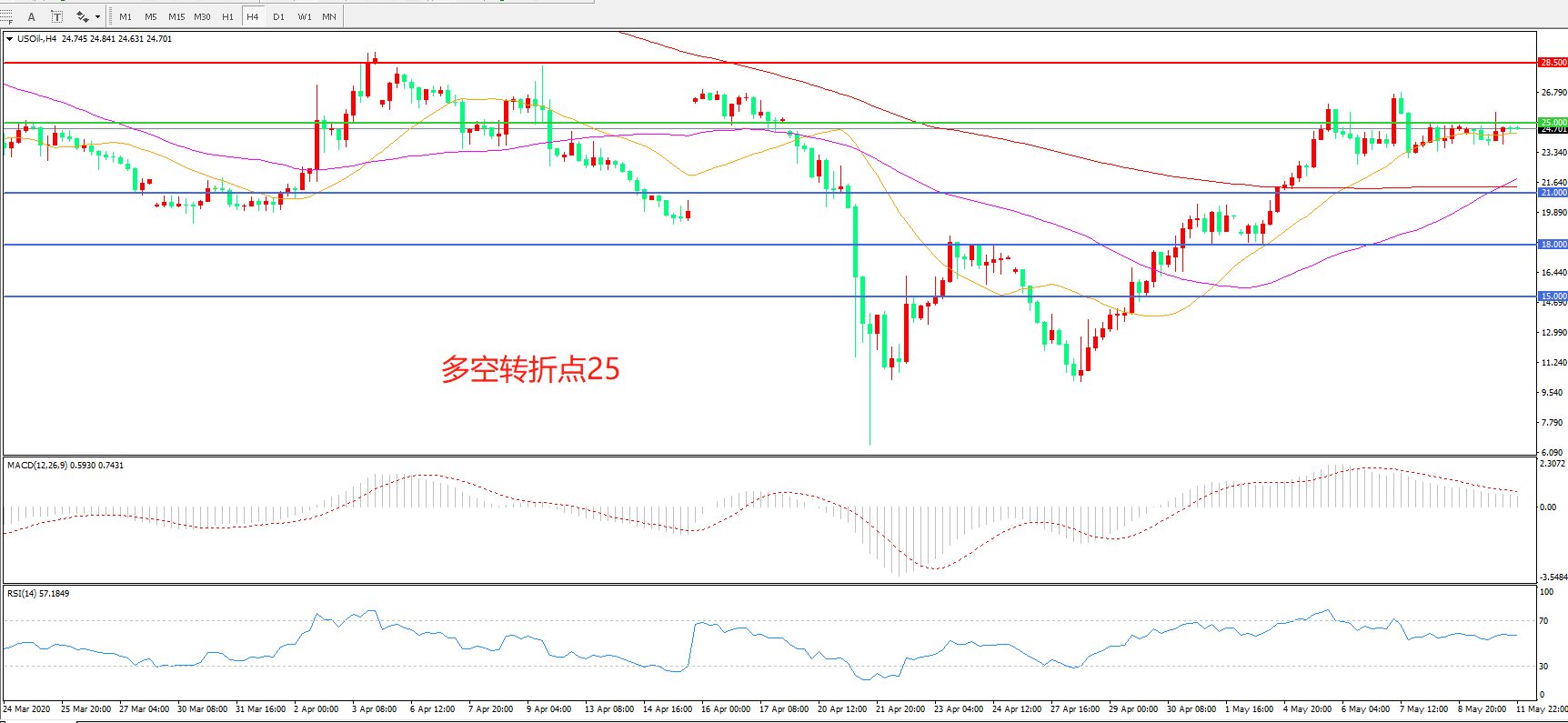 4小时图看,油价延续高位震荡,整体波幅不大,25美元成为短期阻力,均线系统走平,MACD红柱缩短,RSI指标走平,短期有震荡回落风险。