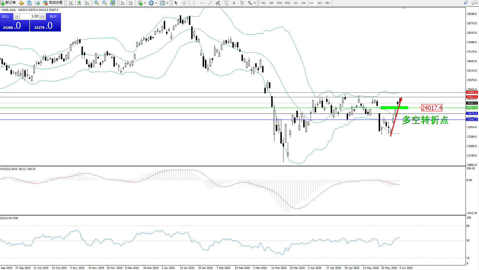 香港恒生指数6月4日(周四)收盘上涨40.68点,涨幅0.17%,报24366.30点;港股三大指数收盘涨跌不一,大市成交额较昨日有所下降,至1254.11亿港元,南下资金净流入16.97亿港元。港股连续三天涨超过1300点,今天冲高回落,一度转跌。消费股集体爆发,中国飞鹤收涨近5%,周黑鸭涨近4%;美团延续涨势,尾盘拉升收涨超6%再创历史新高;A股三大指数今日延续震荡整理态势,最终收盘涨跌不一。行业板块涨跌互现,地摊经济概念股延续涨停潮。北向资金今日净流入41亿元。港股地摊经济同样火爆,五菱汽车尾盘冲高,最高涨超70%,两日涨幅超150%。“地摊经济”受关注,利好消费行业。根据复盘,“地摊经济”的相关政策放开之后,消费行业的市场表现会有一定提升,在市场走势较弱的环境下提升更为明显,但整体提升有限。