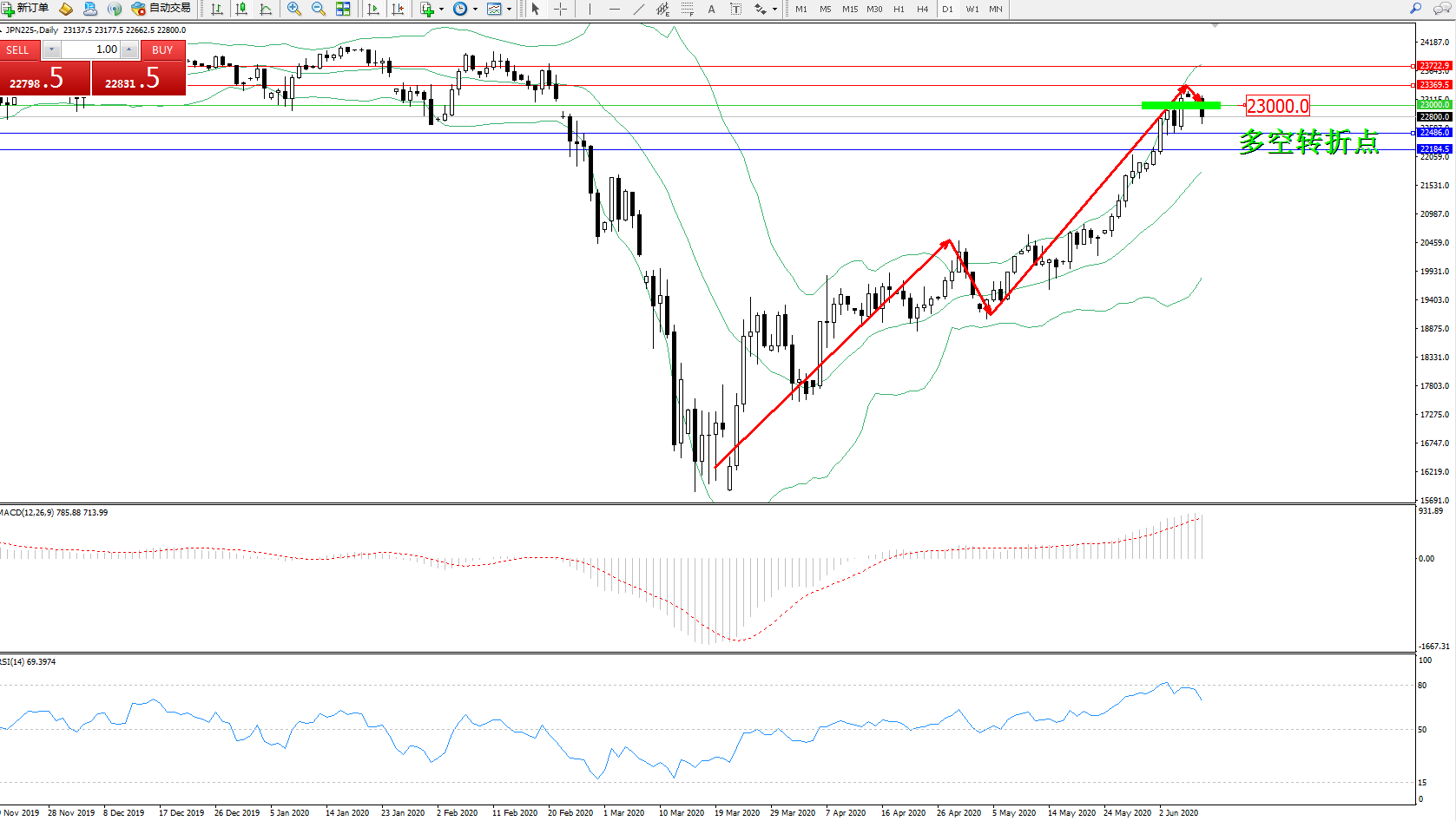 日经225指数6月9日(周二)收盘下跌82.10点,跌幅0.35%,报23096.00点。日本首相安倍晋三:日本经济当前正遭受比雷曼危机时更大的打击,需要采取前所未有的措施来保障就业;经济前景不确定性依然存在,风险人气没理由火力全开,因此市场参与者在经历了汇市上周的走势后决定进行获利了结;东京股市下跌引发短线基金进行美元多头平仓,进而推动了汇率的跌势;这基本上是昨日走势的延续,市场认为美联储有实行收益率曲线控制的可能。市场参与者目前在等待美联储周三结束的为期两天的政策会议,不过由于非农就业岗位意外增加,他们已经不再预测美联储会采取负利率的可能性。
