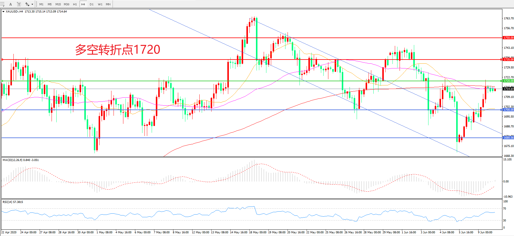 周二(6月9日),美股大幅反弹后投资者选择获利回吐,黄金短线拉升后一度突破1720关口,小幅走低后收报1713.69美元/盎司。前段时间的盲目乐观的市场情绪推动美股大涨,金价承压,一旦美股出现回落迹象,满目疮痍的经济,骚乱暴动的示威将重新进入投资者视野,所以对于价值投资者来说,近期的回调是非常难得的上车机会。
