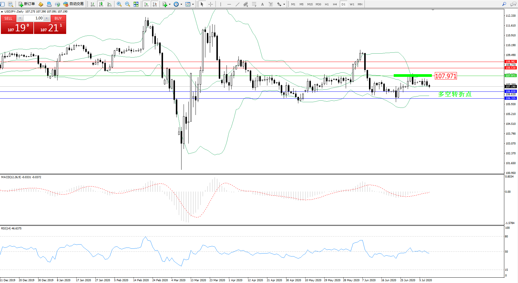 交易策略:107.971下方看跌,目标106.830、106.335