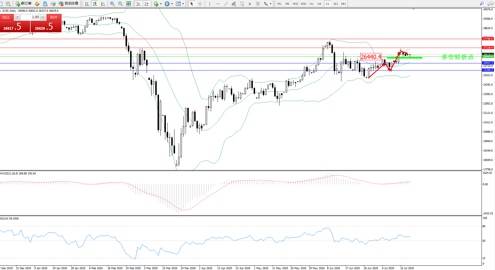 技术点评:长时间纠结于布林带指标通道内持续窄幅震荡走势中,多次试探上轨附近节点后,终究多头动力破位上扬,但后续动力略显不足,突破布林带指标上轨附近关键节点后有回撤迹象,关注26440附近转折点,布林带指标呈收口走势后有张口态势,关注上方转折点,MACD指标长时间纠结于0轴线附近弱势徘徊有上扬迹象,RSI指标处于50均衡线上方维持窄幅整理有开始有拉升上移走势;