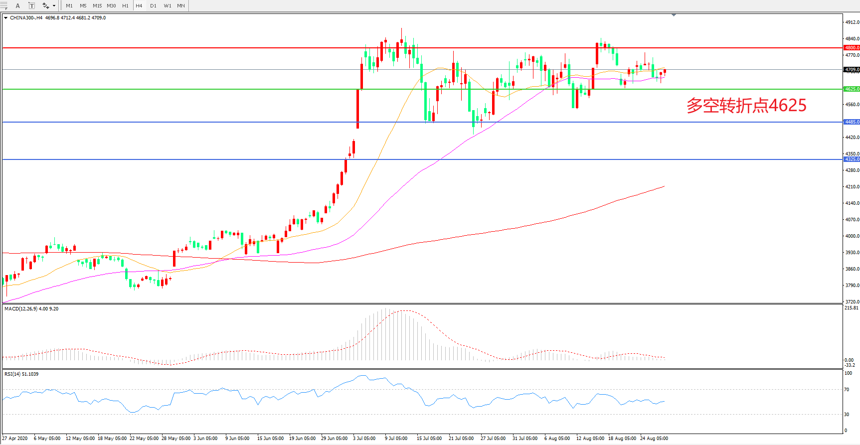 4小时图看,沪深300延续窄幅震荡,整体表现相对低迷,4625成为短期支撑,4800成为上方阻力,均线系统走平, MACD红柱缩短,RSI指标向上,日内延续震荡概率较大。