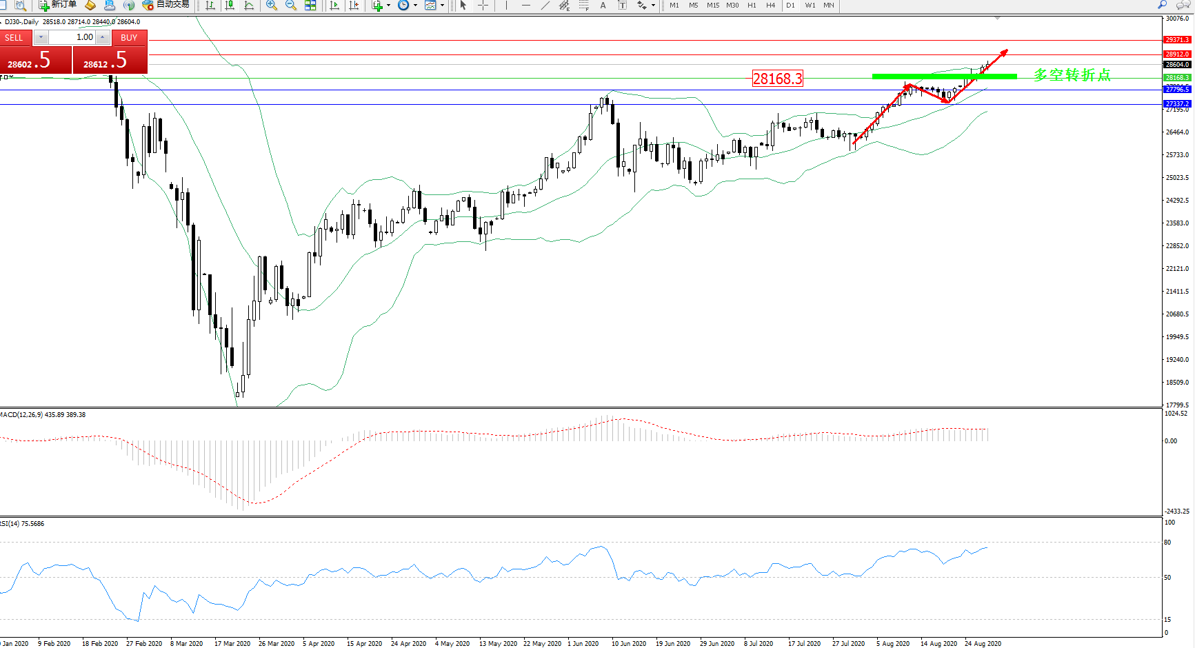 道琼斯指数8月28日(周五)收盘上涨161.60点,涨幅0.57%,报28653.87点。美股三大指数集体收高,美国股市以历史新高结束全周交易,美联储的新通胀策略在全球市场引起连锁反应。股市似乎两头都受益,一方面经济动能显现出改善迹象,货币政策持续宽松,另一方面财政支持政策也即将出台。周四美联储的鸽派声明很可能给了风险资产想要的承诺。周五数据显示美国消费者支出反弹降温,8月份可能进一步走弱;投资者在月底重新平衡投资组合,也给该指数造成压力。10年期实际收益率在一度跌至-1.066%,后回升到-1.0445%;连续第二周下降。美联储的鸽派政策和美国经济复苏乏力都帮助压低美元。下月充足的美债发行也可能使美元走低。
