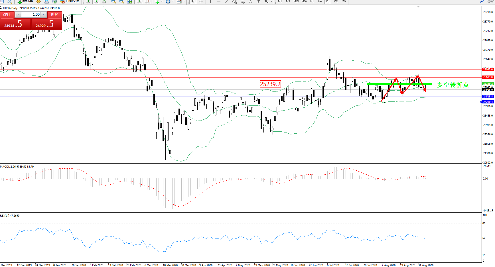 香港恒生指数9月3日(周四)收盘下跌112.49点,跌幅0.45%,报25007.60点;港股三大指数均收跌,恒指早盘一度转涨,午后再次回落,港股在25000点水平继续震动,市场分化各走极端的情况未改仍有待改善。生物医药股集体上涨,启明医疗大涨超13%;近期强势的大型科技股今日全线回调,小米大跌7%,美团跌近4%,京东跌2.65%,阿里跌2.4%。今日南下资金净流入28.03亿港元,大市成交额为1465亿港元。港股通今日净买入腾讯(0700.HK)2.4亿港元(连续9日净买入累计约62.2806亿港元),华润置地(1109.HK)2.02亿港元,比亚迪电子(0285.HK)8693万港元;净卖出小米(1810.HK)9.65亿港元(连续2日净卖出累计约22.19亿港元),舜宇(2382.HK)5621万港元。在市场分化、资金分流出现极化后,相信港股盘面仍在重建稳定性的阶段,目前可以说是处于比较紧绷、也是比较脆弱的状态,如果情况迟迟未能出现改善,要注意对系统的平衡会带来不稳定性,对市场有构成波动加大的可能。