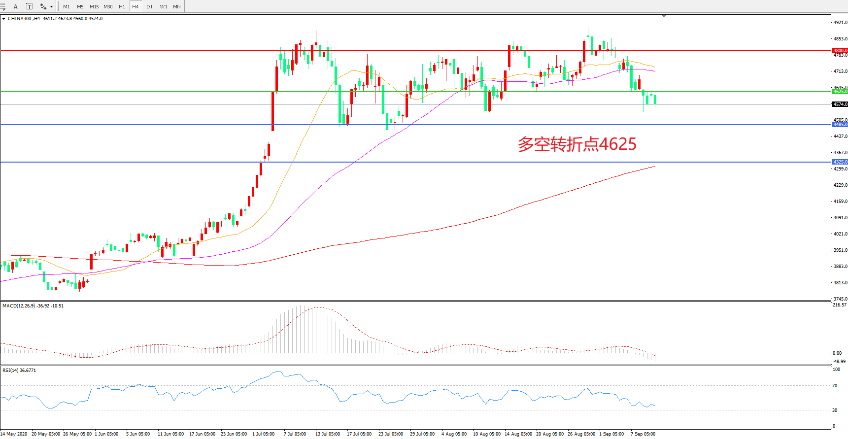 4小时图看,沪深300冲高回落,短期走势疲软,4625成为短期多空分水岭,均线系统走平, MACD绿柱增加,RSI指标向下,日内延续震荡概率较大。