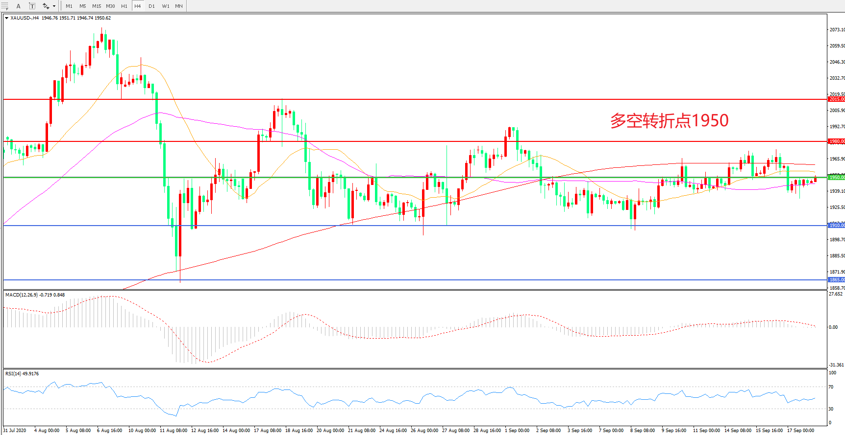 4小时图看,金价冲高回落,多空博弈胶着,1950成为短期争夺焦点,MACD红柱缩短,RSI指标走平,日内延续震荡概率较大。