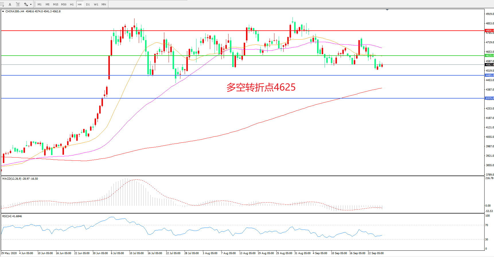 4小时图看,沪深300延续低位震荡,短期走势相对低迷,4625成为多空分水岭,均线系统走平, MACD绿柱增加,RSI指标向下,日内延续震荡概率较大。