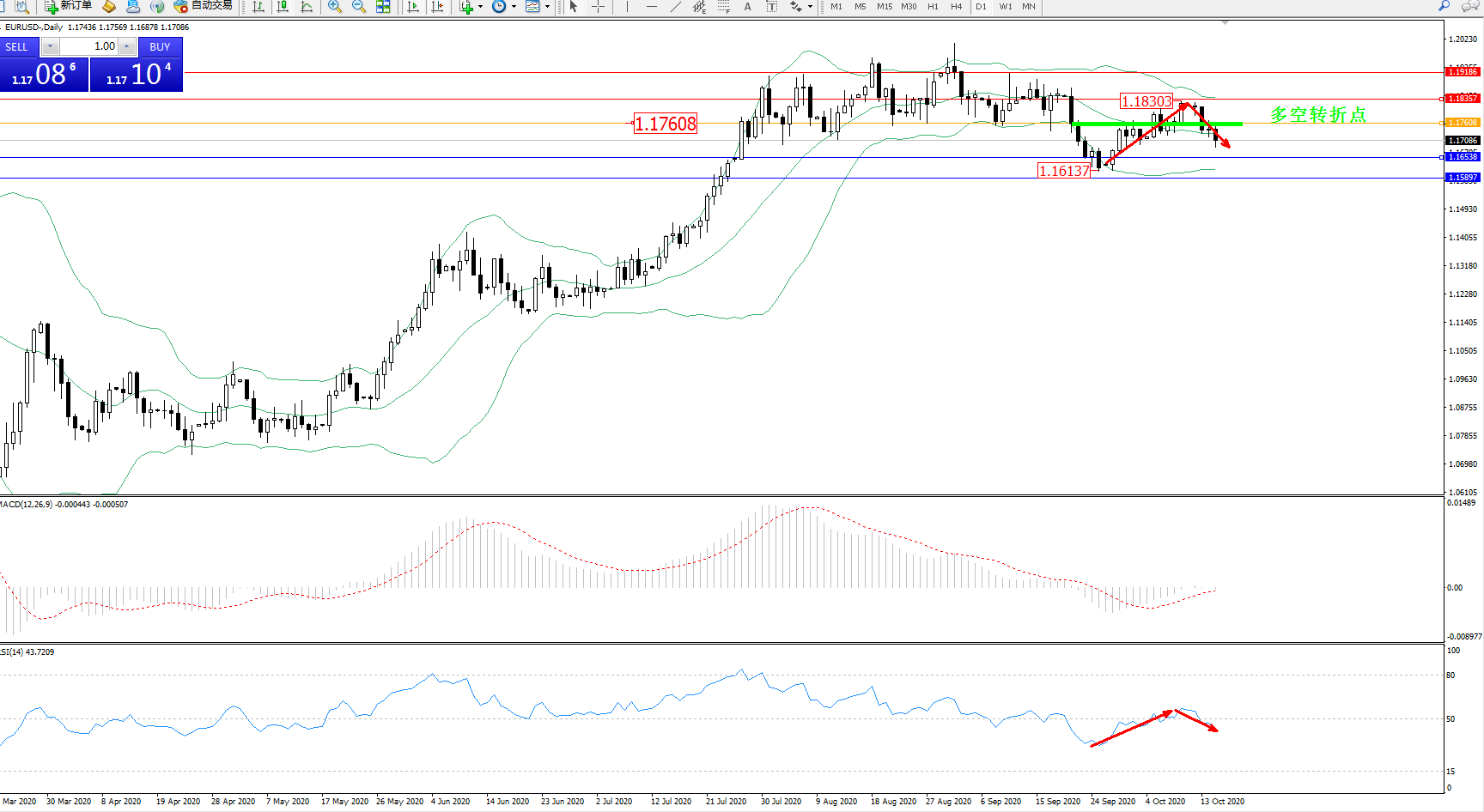 欧元兑美元弱势震荡回撤至1.17056附近整理,欧洲新冠病例数重新激增,引发各界对全球新一波疫情封锁举措的担忧,同时对美国在11月3日大选前通过刺激方案的憧憬也在消退,提振了美元避险需求。法国实施宵禁,其他一些欧洲国家则是关闭学校、取消非紧急手术,并招募医学院学生充实医务工作者队伍。各国政府面临新冠病毒重新来袭的噩梦,外界则担心新一波疫情封锁举措可能拖累全球复苏。欧洲每日新增病例达到约10万人,已经超越美国。多数欧洲国家在夏季放宽了封锁举措,开始重振受到第一波疫情重创的经济。但社会生活回归正常让整个欧洲大陆感染人数重新激增。在三、四月间,欧盟采取了前所未有的措施来保证贷款,补贴工资和推迟偿债,以帮助企业度过健康危机。同时,欧洲央行推出了自己的计划,放宽了资本要求,以支撑银行的资产负债表,并确保持续向更广泛的经济提供贷款。