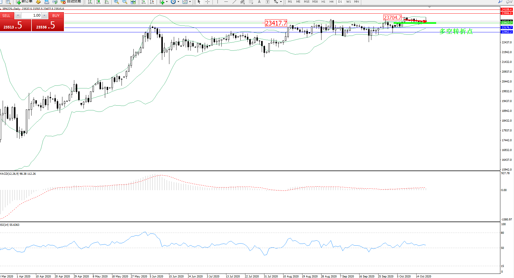 日经225指数10月19日(周一)收盘上涨255.37点,涨幅1.09%,报23666.00点。上周美国股市震荡上行,标普500指数取得连续第三周上涨。不过市场人士认为,新一轮财政刺激方案难以达成等不确定性将限制涨势;很可能在美国大选之后才能获得通过。由于缺乏明显的驱动力,看上去未来两周全球股市上行空间有限,直到美国大选尘埃落定;日本央行行长黑田东彦在G30线上国际银行研讨会上表示,不需要改变央行的通胀目标或前瞻性指引,即使美国和欧洲都在重新评估政策框架以寻求更好的方式来刺激经济增长;日本央行已经具备一个与美联储的平均通胀目标“非常相似”的框架,承诺通过增加货币基础直到通胀率稳定超过其2%的目标。全球货币政策依旧处于宽松格局,日经新闻:日本行政改革大臣河野太郎说将审查可再生能源的结构。
