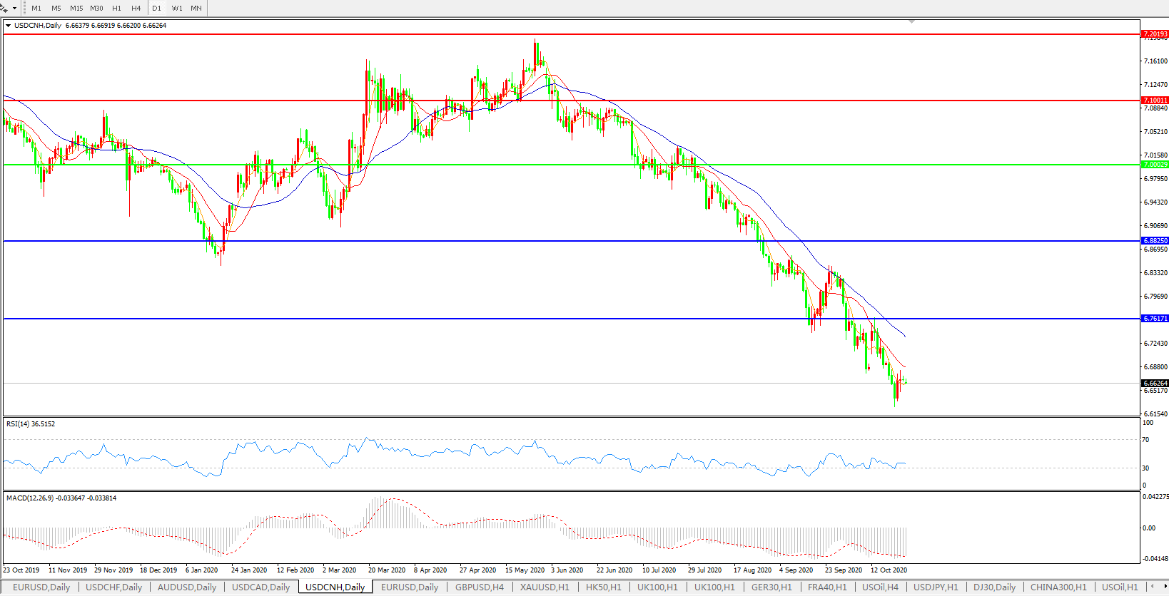美元兑人民币USDCNH 日线图: