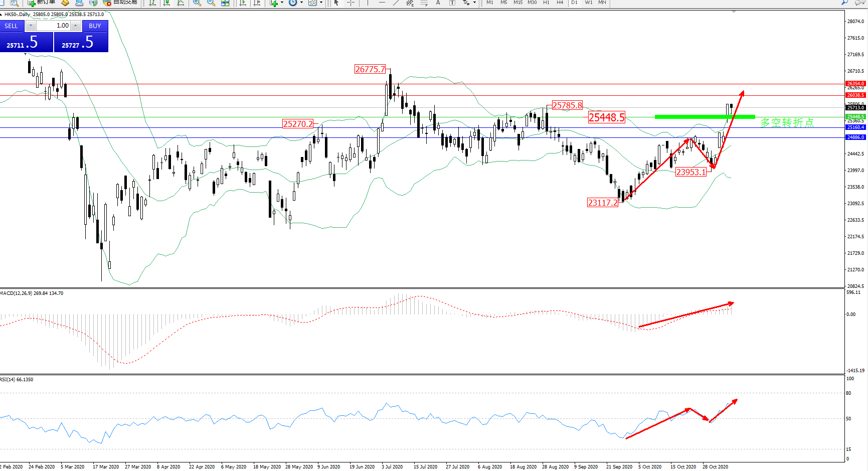 交易策略:25448上方看涨,目标26038、26354