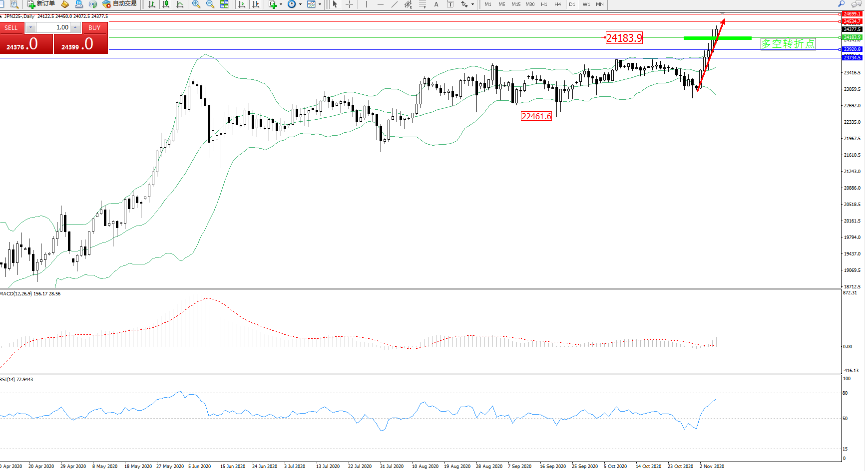 日经225指数11月6日(周五)收盘上涨239.72点,涨幅0.99%,报24345.00点。日本9月家庭支出较上年同期下滑,实质薪资连七个月下降,表明内需乏力将持续拖累日本经济复苏。9月家庭支出同比下滑10.2%,为史上第四大降幅,预估中值为下滑10.7%。该数据突显出当局在权衡避免疫情扩散和重振经济活动方面面临的挑战。然支出较前月增长3.8%,表明家庭逐步适应疫情下的生活,这带来一些乐观情绪。第一生命经济研究所首席经济分析师新家义贵说,“由于人们似乎已经习惯了应对新冠肺炎,9月服务支出有所复苏。我们预计消费者支出将渐渐增加,不过感染病例可能再现是一大风险。”日本经济4-6月创下战后最严重萎缩后正在触底回升,部分得益于出口和产出反弹。但分析师称,消费和资本支出低迷可能使任何经济复苏都力度不大。他们说,日本央行刺激经济增长的弹药已经所剩无几,政府有责任采取更多财政刺激措施来缓解疫情冲击。日本首相菅义伟本月料将宣布新的刺激计划,帮助经济摆脱危机影响。菅义伟周五对国会表示,“克服疫情危机并重振日本经济仍然是我们的首要任务。”