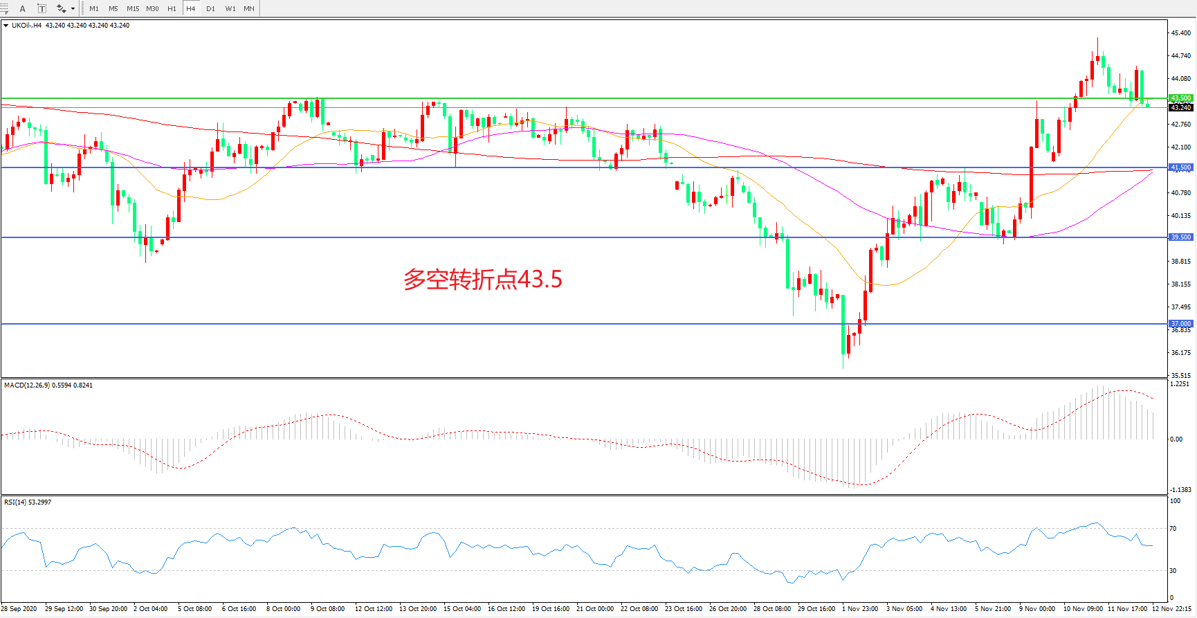周三(11月12日),疫情二次爆发来势汹汹,欧洲多国病例加速上升,美国新冠确诊病例再创新高,EIA原油库存意外增加427.80万桶,打压了市场中的风险情绪,布伦特原油震荡下行,收报43.24美元/桶。美联储鲍威尔表示评估疫苗消息对经济的影响还为时过早,近期主导市场的疫苗利好效应将逐渐减弱。