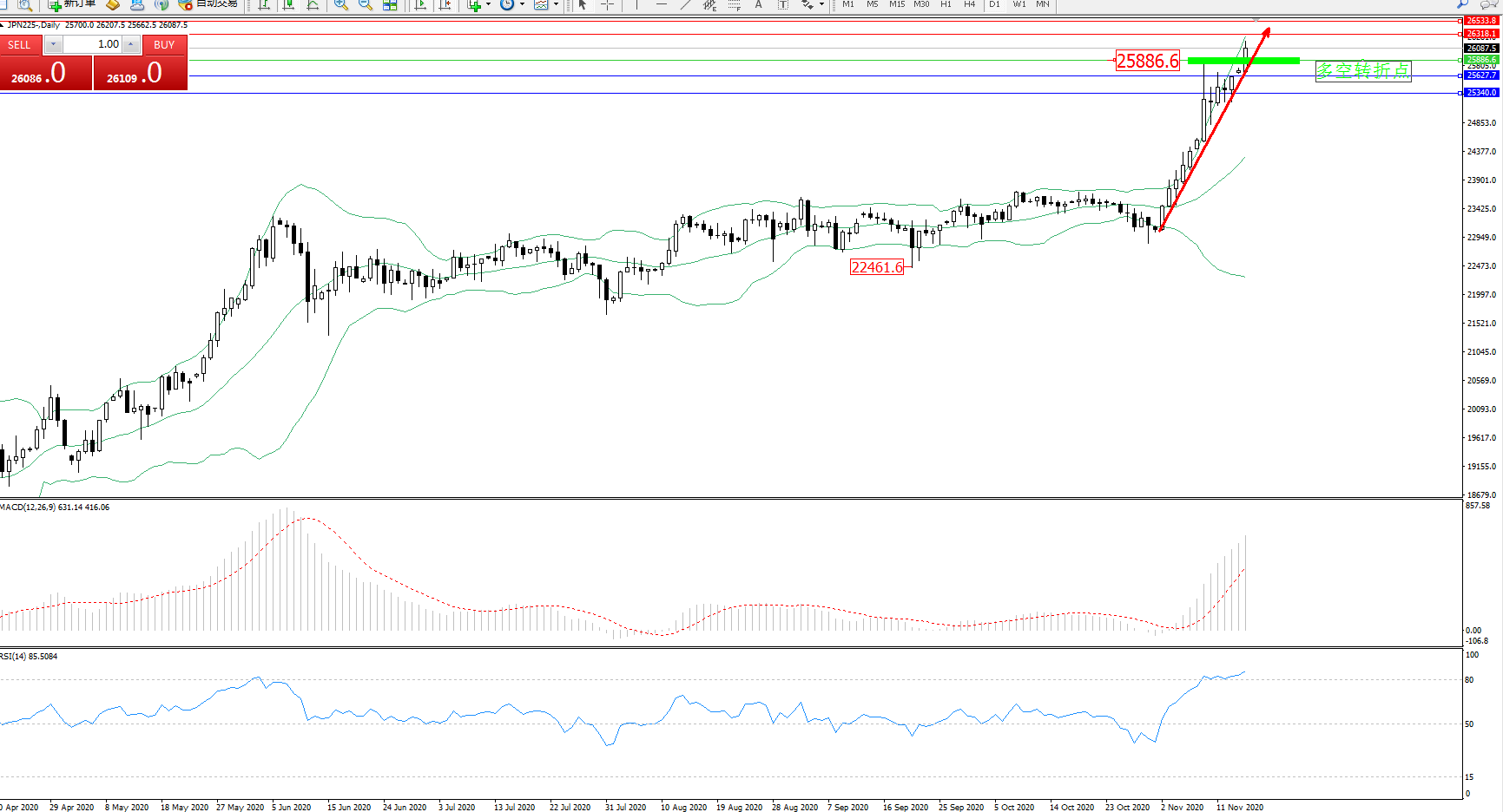 日经225指数11月16日(周一)收盘上涨524.63点,涨幅2.07%,报25910.50点。日本第三季度国内生产总值(GDP)折合年率增长21.4%,超出市场预期的18.9%,日本内阁府称,第三季度GDP增长为52年来最大。日本经济再生大臣西村康稔表示,日本经济正在稳步回升,但复苏进程仍处于中途。资本支出的疲软显示出商业情绪仍然低迷。实现内需驱动型的日本经济复苏是非常重要的。同时必须警惕海内外疫情对国内消费、出口和产出的影响等风险。市场持续憧憬即将有新冠病毒疫苗推出,强化投资者入市意欲。亚太股市今早(16日)造好虽然美国新冠病毒疫情持续恶化,但当选总统拜登无意在全国实施封锁措施,纾缓投资者的忧虑。