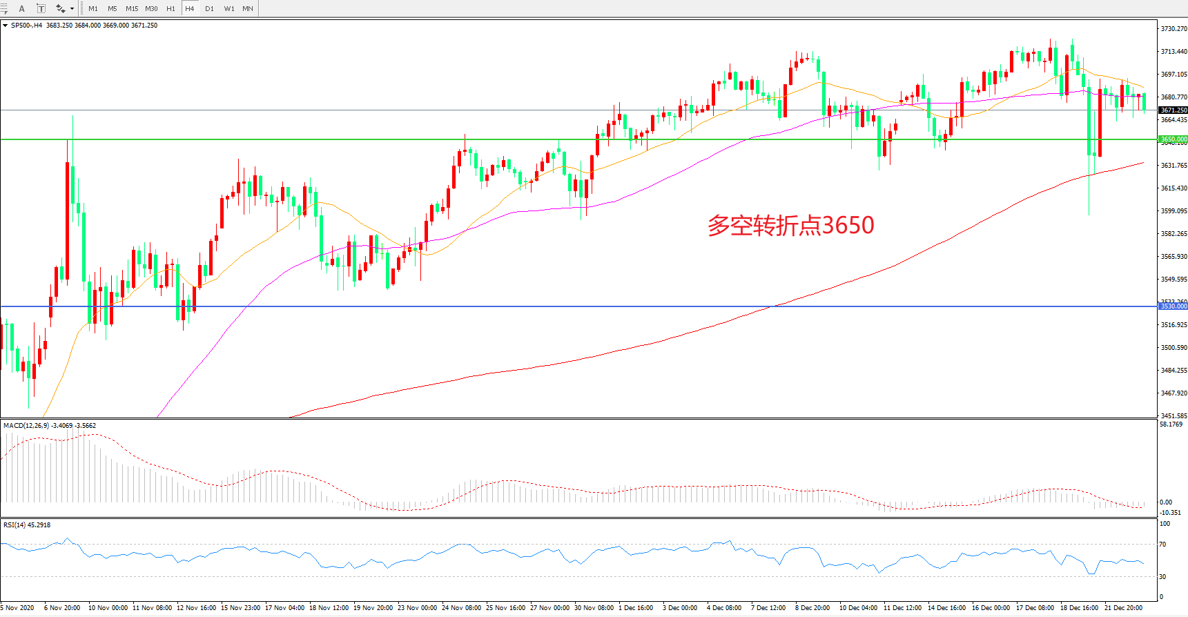 4小时图看,标普500延续高位震荡,整体波幅不大,下方支撑较为明显,均线系统逐渐走平,3680成为运行中枢,MACD红柱缩短,RSI指标走平,日内延续震荡概率较大。