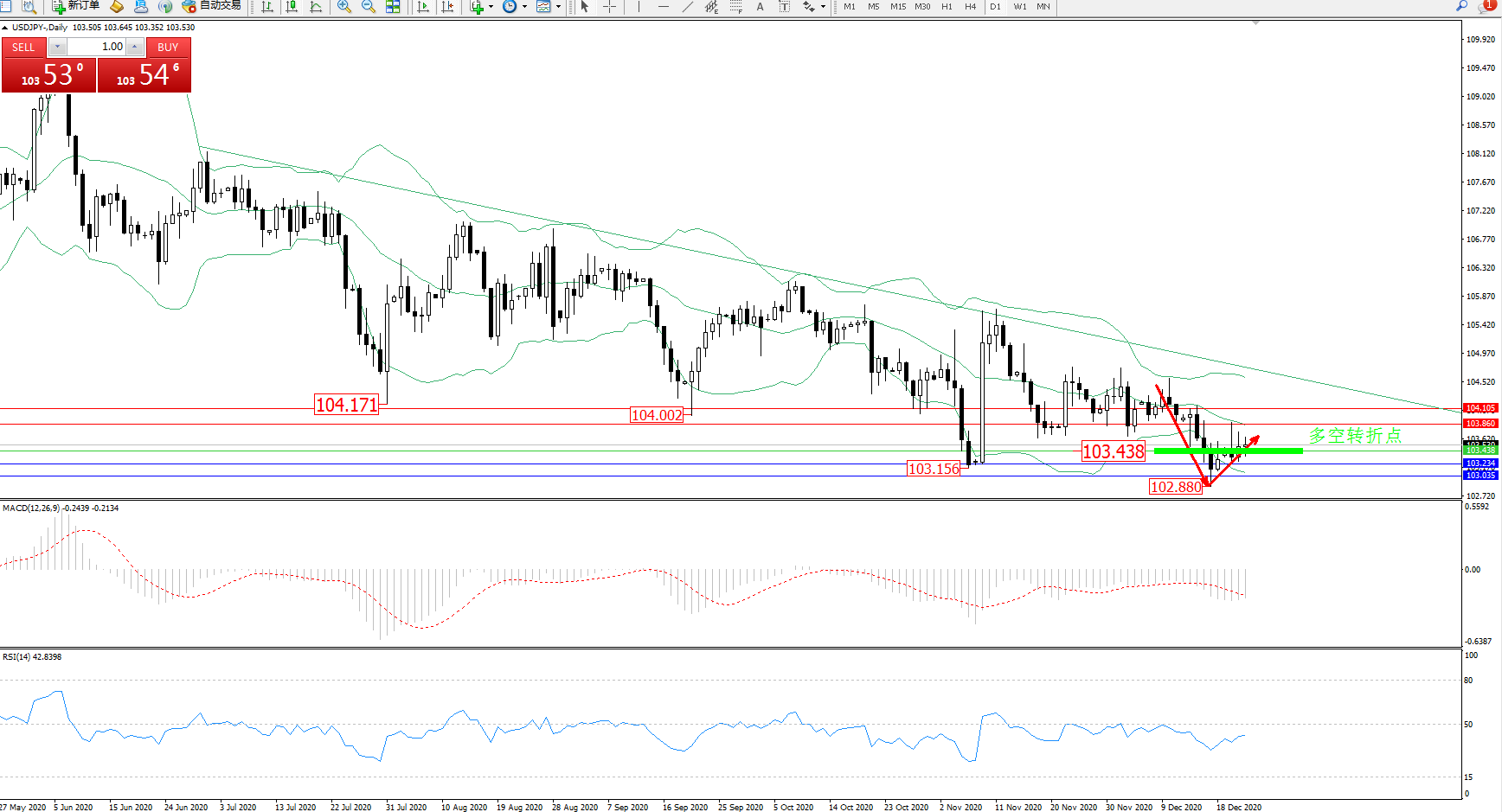 技术点评:空头动力延续布林带指标通道持续震荡下行后抵达102.880附近后得到支撑开始反转震荡上扬,处于中下轨区间弱势整理平移中,布林带指标呈张口走势持续后有收口迹象,MACD指标处于0轴线下方空头区域维持整理平移中,RSI指标处于50均衡线下方空头区域震荡后底部开始反转上移中;