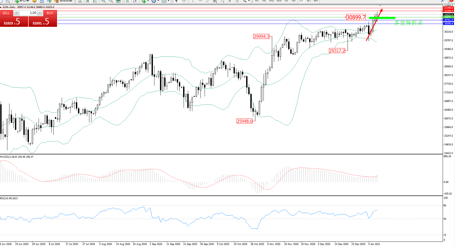 交易策略:30899上方看涨,目标31200、31348