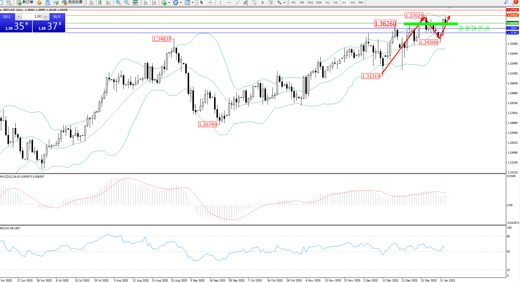 交易策略:1.36260上方看涨,目标1.37024、1.37534