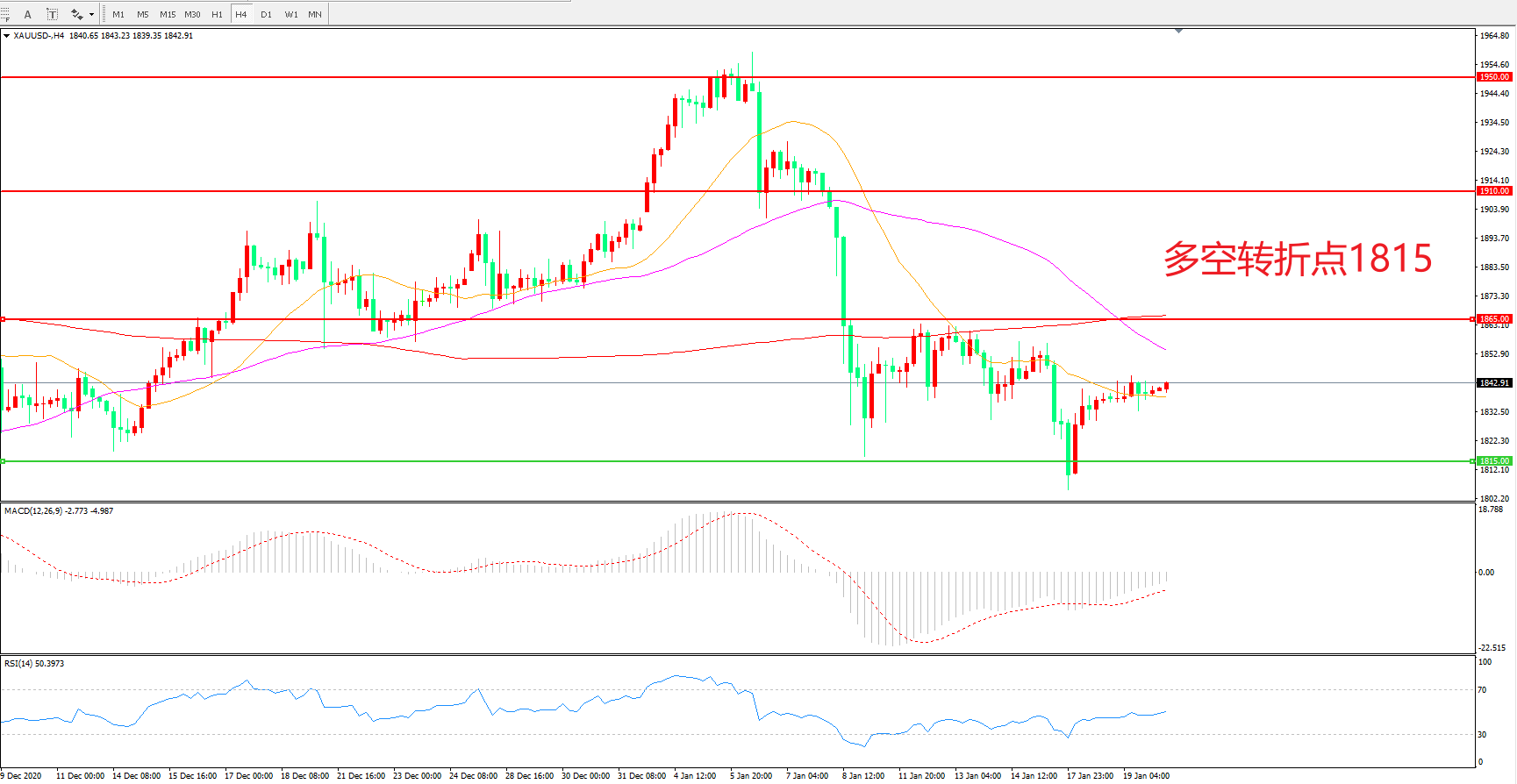 4小时图看,金价在回踩1815支撑后震荡拉升,短期走势有所回暖,21周期均线成为短期支撑,中期横盘整理概率较大, MACD绿柱缩短,RSI指标走平,日内有望延续震荡。