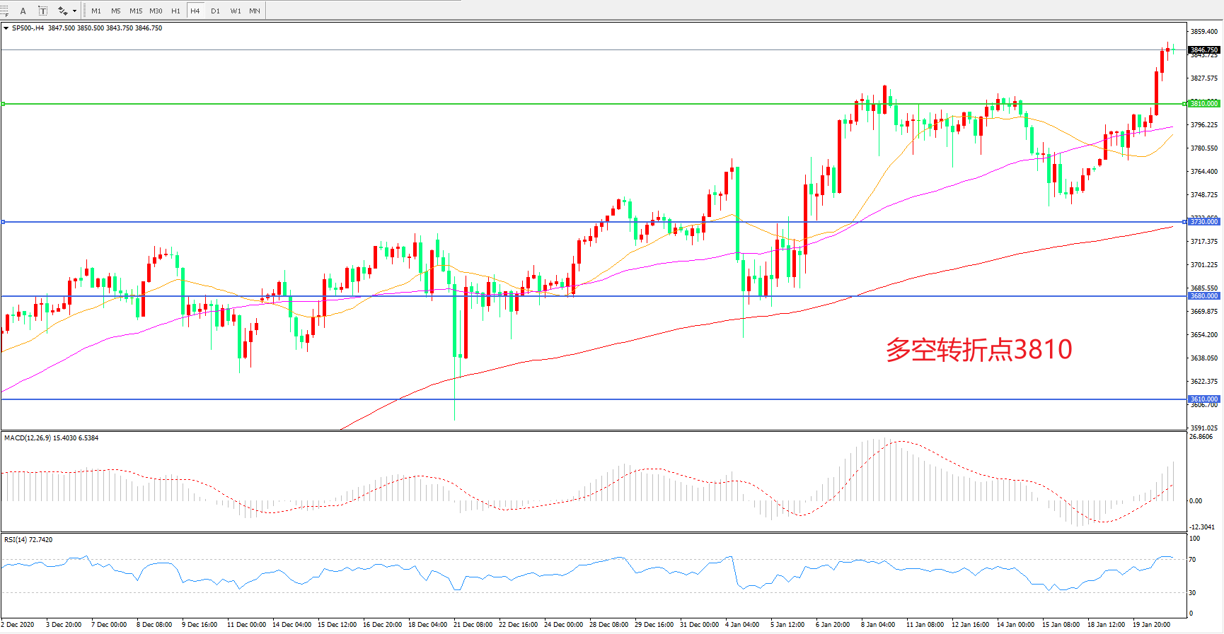 4小时图看,标普500长阳拉升,突破前期整理区间,上行趋势十分明显,3810成为下方支撑,短期均线拐头向上,MACD红柱增加,RSI指标走平,日内延续震荡概率较大。