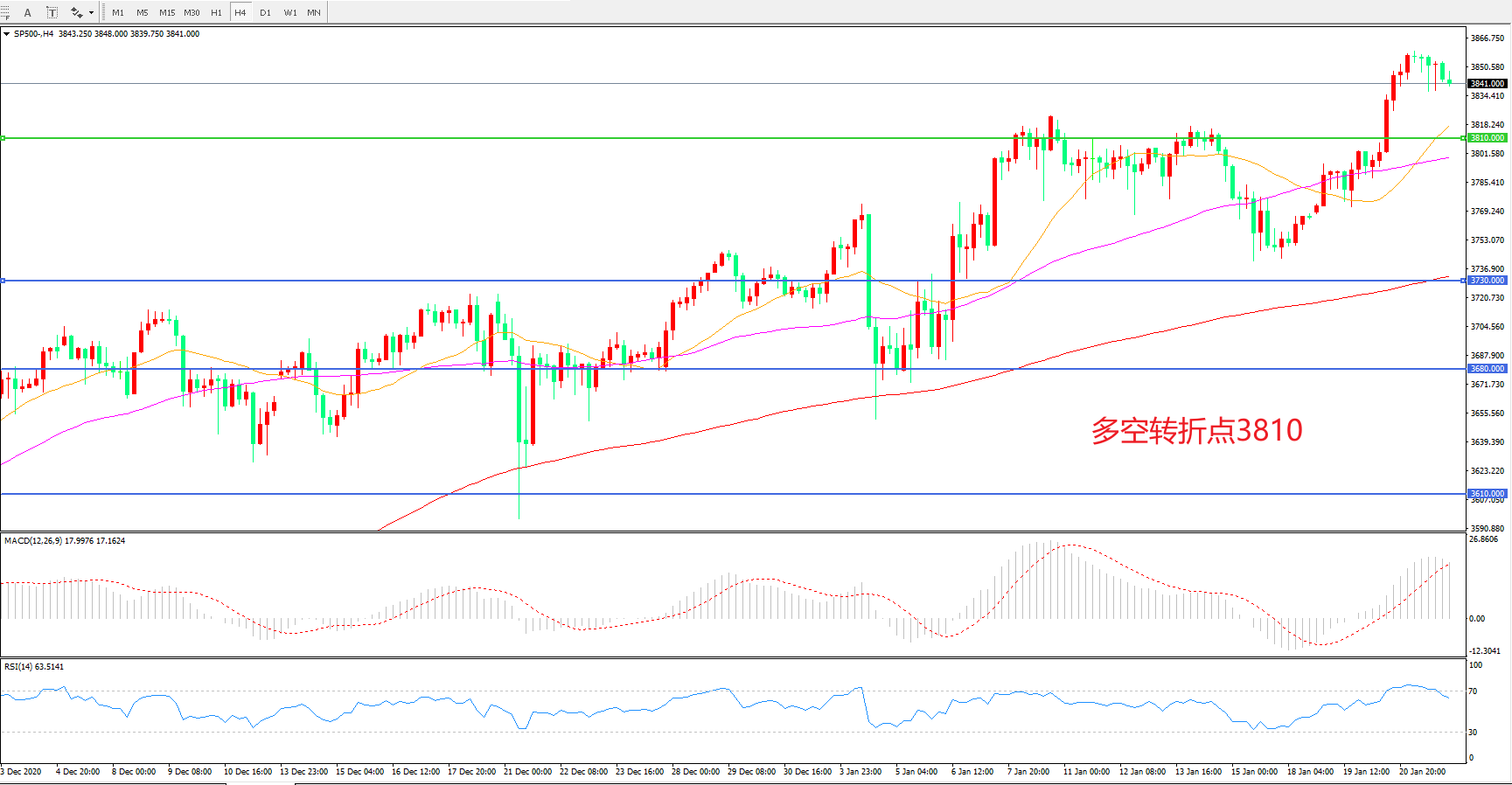 4小时图看,标普500长阳拉升后小幅回落,上行趋势暂缓,3810成为下方支撑,短期均线拐头向上,MACD红柱增加,RSI指标走平,日内延续震荡概率较大。