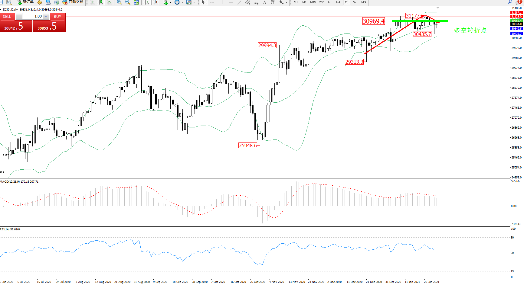 技术点评:多头动力延续布林带指标通道中上轨区间持续震荡上扬至31177位置后遇阻开始震荡回撤下行,然多头动力短暂快速下挫后急速回升至中轨附近节点,布林带指标呈收口走势中,关注中轨附近节点,MACD指标处于多头区域维持整理平移中,RSI指标处于50均衡线上方窄幅震荡后弱势徘徊中;