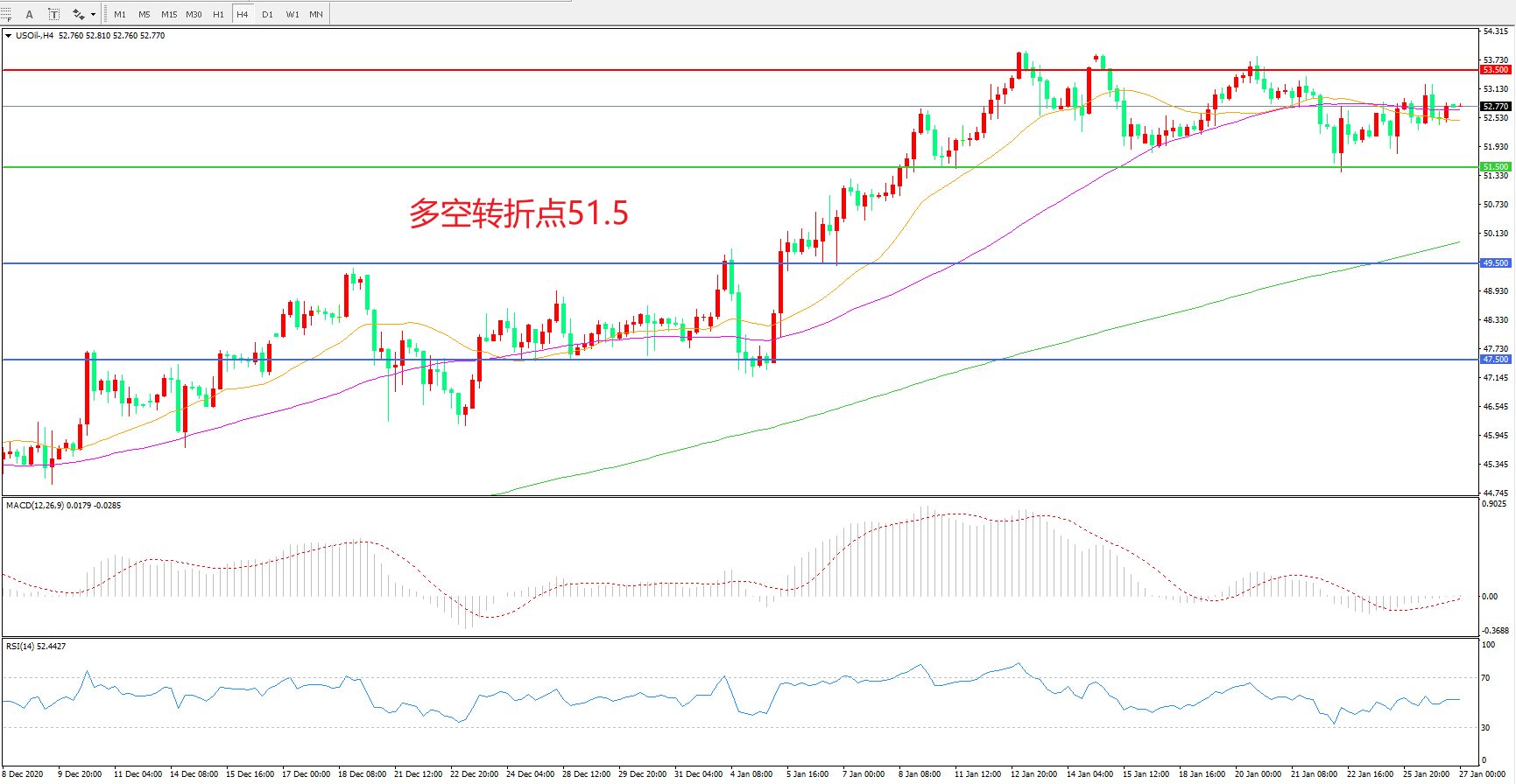 周二(1月26日),全球累计确诊病例超过1亿例,加之美国迅速批准新的经济刺激计划的希望日渐渺茫,引发了市场对原油需求复苏速度的质疑,但沙特首都遭导弹袭击引发了市场情绪的紧张,美国WTI原油延续高位震荡,收报52.78美元/桶。