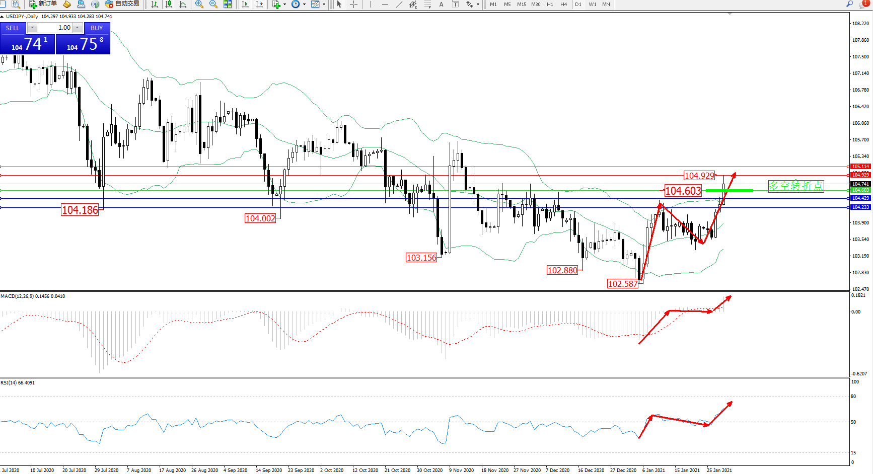 技术点评:低位多头动力呈阶梯震荡上扬,突破布林带指标上轨附近节点抵达104.929附近节点后开始震荡,布林带指标呈收口走势后开始有张口迹象,关注上轨附近节点,MACD指标处于0轴线上方多头区域维持震荡向上移动持续拉升中,RSI指标处于50均衡线上方多头区域不断上移中;