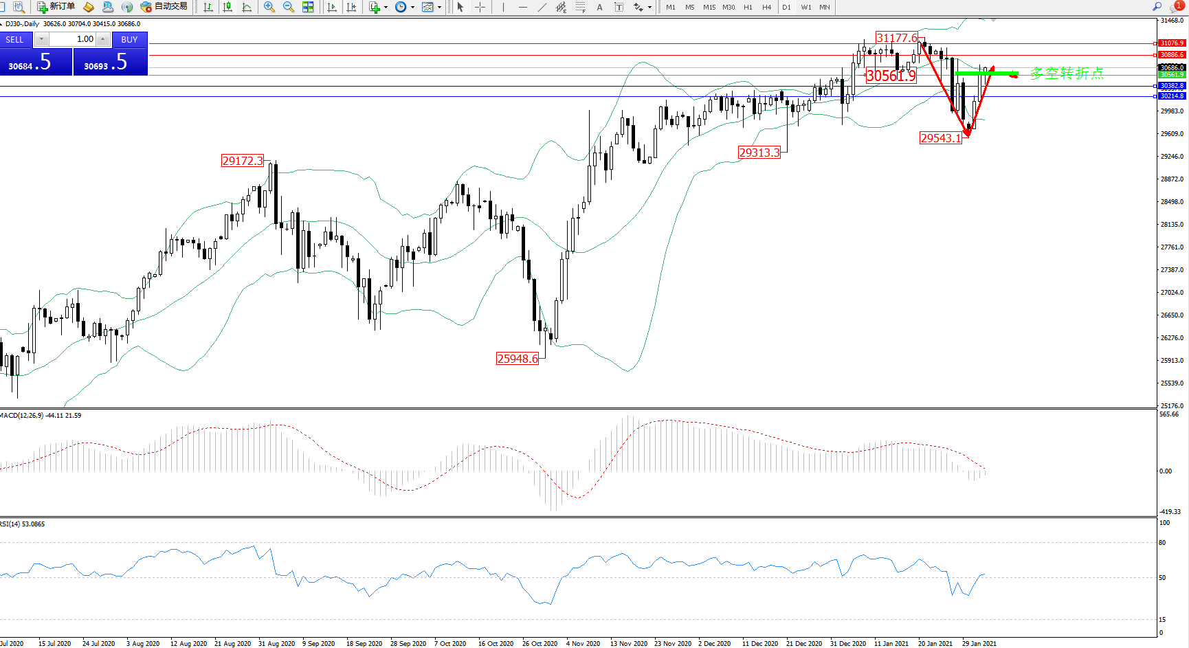 道琼斯指数DJ30—— 日K线图显示: